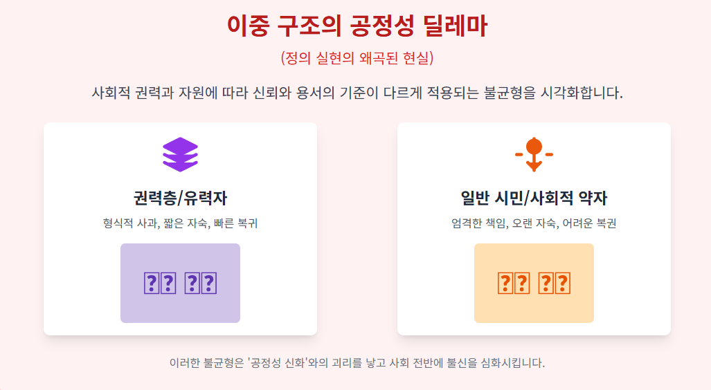 지도층의 행동은 국민의 거울이 됩니다. '유전무죄 무전유죄' 인식이나 특권 남용에 대한 불신은 지도층의 불공정한 행동에서 비롯됩니다. 따라서 신뢰를 회복하기 위해서는 법적 제재를 넘어선 도덕적 책임감과 솔선수범이 요구됩니다. 이는 회복적 사법이 개인 간의 갈등을 넘어 사회적 갈등 해결에도 적용될 수 있음을 시사하며, 공인들의 '자숙 문화'가 형식적인 것이 아닌 진정한 반성과 책임 이행으로 이어져야 함을 의미합니다.