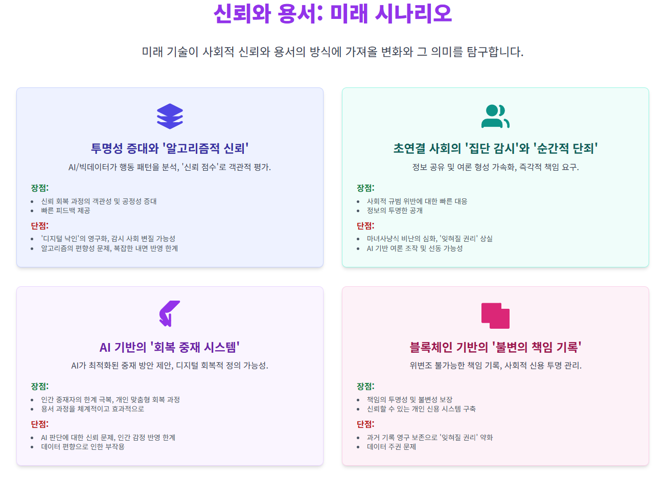 다음 표는 AI와 빅데이터 기술이 신뢰와 용서에 미칠 수 있는 긍정적 및 부정적 영향을 명확히 대비시켜 보여줍니다. 기술의 잠재력을 활용하면서도 그 한계를 인식하고 윤리적, 제도적 보완책을 마련해야 한다는 주장이 유용합니다.