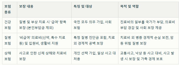 건강보험의 '비급여' 영역은 질병보험과 상해보험의 필요성을 높이는 핵심 요인입니다. 이 세 가지는 각각 다른 역할을 하며 서로를 보완하는 관계에 있습니다.